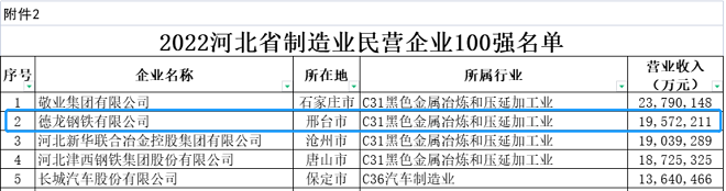 德龍鋼鐵集團榮登河北民營企業百強第二位