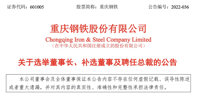 11月22日,重慶鋼鐵發布了《關於選舉董事長、補選董事及聘任總裁的公告》(以下簡稱《公告》)。