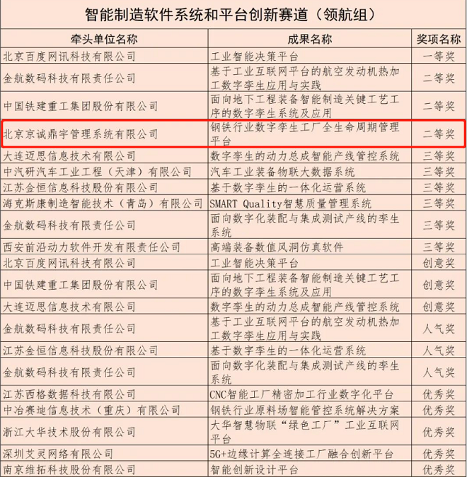 11月23日,以“數智賦能,鏈通未來”為主題的世界智能製造大會盛大開幕,第二屆智能製造創新大賽頒獎儀式在大會開幕式上隆重舉行。中冶京誠鼎宇公司申報的“鋼鐵行業數字孿生工廠全生命周期管理平台”脫穎而出,榮獲軟件係統與平台創新賽道高級別組別領航組二等獎,名列鋼鐵行業參賽作品第一的好成績。