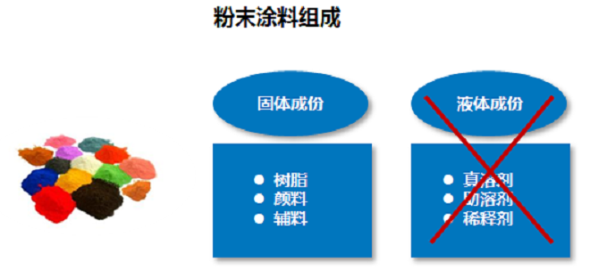 要改變這種沿用了30多年的汙染型溶劑彩塗工藝,首先要從塗層介質的原材料入手,將溶劑塗料改為環保型塗料。溶劑塗料所含固體成分僅為55%,其餘45%為有機溶劑,這些有機溶劑在塗料的製作合成、運輸、儲存、稀釋攪拌、塗裝、固化等過程中釋放大量VOCs,對環境造成嚴重汙染。而粉末塗料100%為固體成分,不含溶劑,可徹底杜絕有機溶劑釋放的可能性(圖1)。因此,與溶劑彩塗相比,粉末彩塗最突出的特點就是綠色環保,采用粉末彩塗技術生產及使用彩塗板能實現VOCs零排放的環保效果。