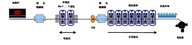 該工藝由兩架串列緊湊布置的可逆式粗軋機組成,軋機中心距僅8m,可實現3個大道次的可逆軋製。與常規分開布置的雙機架粗軋機相比,在生產能力相當的情況下,具有粗軋區長度縮短50m以上、板坯在粗軋區停留時間縮短40s以上、溫降減少40℃以上、加熱爐可低溫出爐以降低噸鋼燃耗0.05GJ/t以上和爐內燒損降低0.1%以上、除鱗點少且除鱗係統耗電量減少15%以上等技術優勢,不僅可以節約初期建設投資,大幅減少生產線運營成本,而且特別有利於不鏽鋼、矽鋼、IF鋼等溫度敏感鋼種的生產,提高產線競爭力。