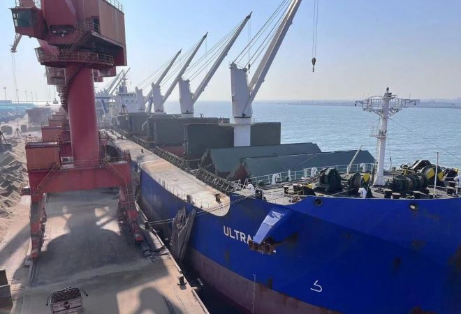 ▲鞍鋼眾元產業綠源科技公司在盤錦港進行水渣裝船作業。