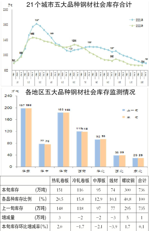 注:從2022年開始,鋼材社會庫存重點監測城市由20個增加到21個,增加城市為蘭州,旬報中社會庫存總量和五大品種庫存量的上年數據均同口徑做出調整。