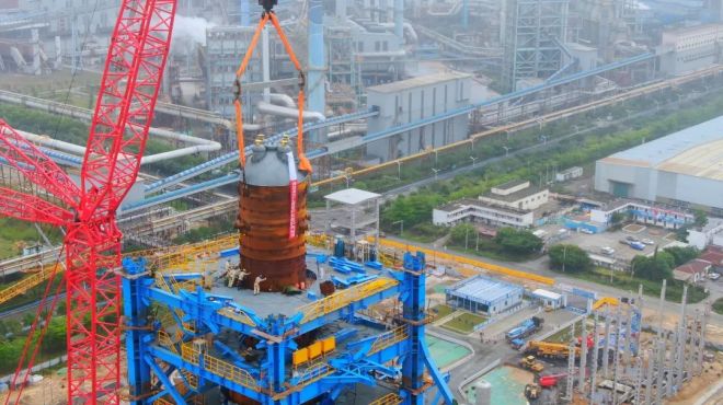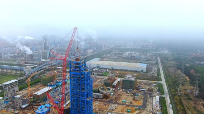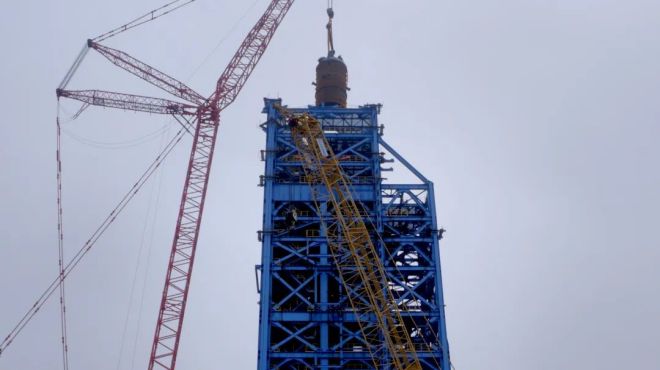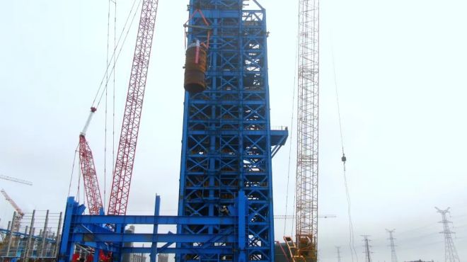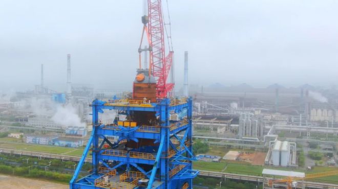 氫基豎爐本體爐殼分5段,第一段於2022年12月23日吊裝完成,第二、三、四段於今年3月中下旬吊裝完成,本次吊裝的第五段爐殼是最後一段爐殼,高約12.6米,重約78.5噸。