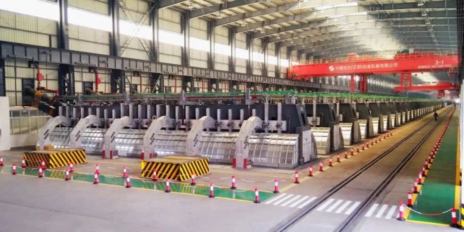 為了進一步發揮酒鋼及周邊能源優勢,2012年6月份,酒鋼實施該項目二期工程建設,設計產能為90萬噸/年電解鋁,設計電流為500千安培,安裝電解槽672台。這是當時世界上電流強度最高、產能最大、設計最先進的電解鋁生產線,其完全建成可以極大地提升中國電解鋁裝備水平。該項目分為兩個係列,每個係列的產能為45萬噸/年,共有4個電解車間,配備4套淨化係統,淨化效率達99.5%。2015年,該項目二期工程建設全部完成,有色金屬產業也順理成章地成為了酒鋼集團的第二個主業。