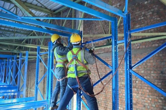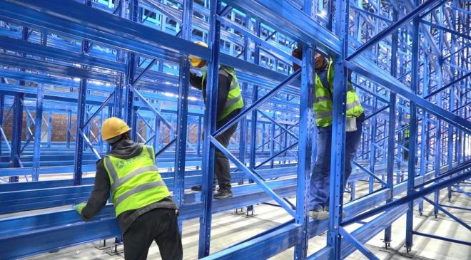 zoujinbaoganggufencangchuzhongxinzhinenglitikugaizaoxiangmudeshigongxianchang,yipianrehuochaotiandejianshejingxiangyingruyanlian,laihuichuansuodejushengchejianghengliangjushengzhianzhuangweizhi,gongzuorenyuanjinzhangmangludijinxingzuzhuang,yipaipaigaodajin8米的貨架構造出一個巨大的立體空間,智能立體庫已初現雛形。