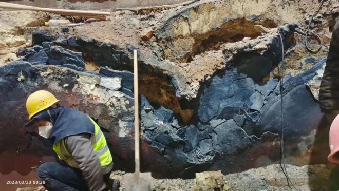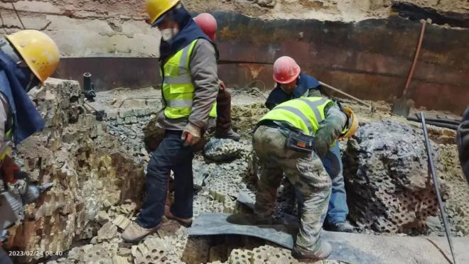豫興公司技術團隊進熱風爐內查看後發現,蓄熱體格子磚床麵已全部被粉塵及渣蝕堵塞,上部高溫區域格子磚板結為一體,板結厚度約1.5米,且格子磚床麵下沉約2米;支撐拱頂直段的托板及內層爐殼已經嚴重碳化損壞成分層狀和粉末狀,存在極大的安全隱患,不言自明!