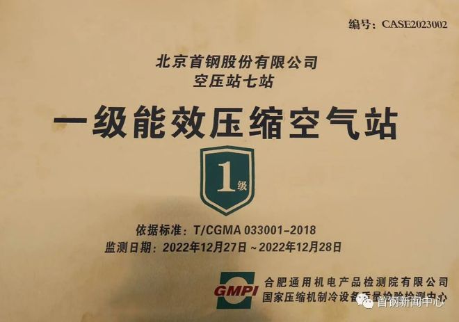 全國首個!首鋼股份空壓機七站被授予“一級能效壓縮空氣站”