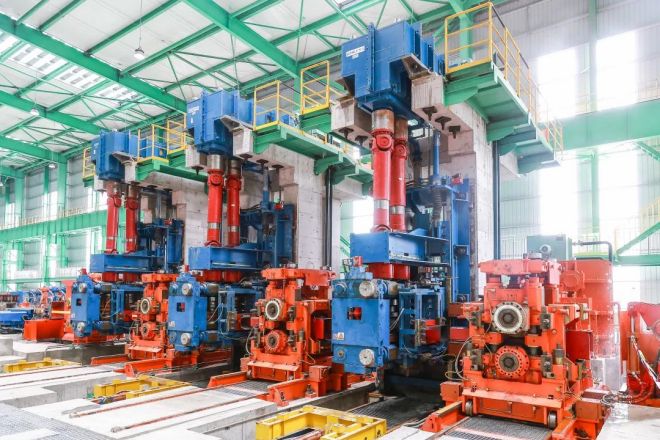 生產線設有燃高爐煤氣步進梁式加熱爐一座,共有58架軋機,分為6架粗軋機組(共用)、10架中軋機組(分A/B線)、4架預精軋機組(分A/B線)、2套精軋機組(分A/B線)。粗、中軋機組及預精軋前2架軋機采用平、立交替布置短應力線軋機。預精軋機組後4架軋機,采用懸臂軋機,均為平、立交替布置,每架軋機均由交流電機單獨傳動。