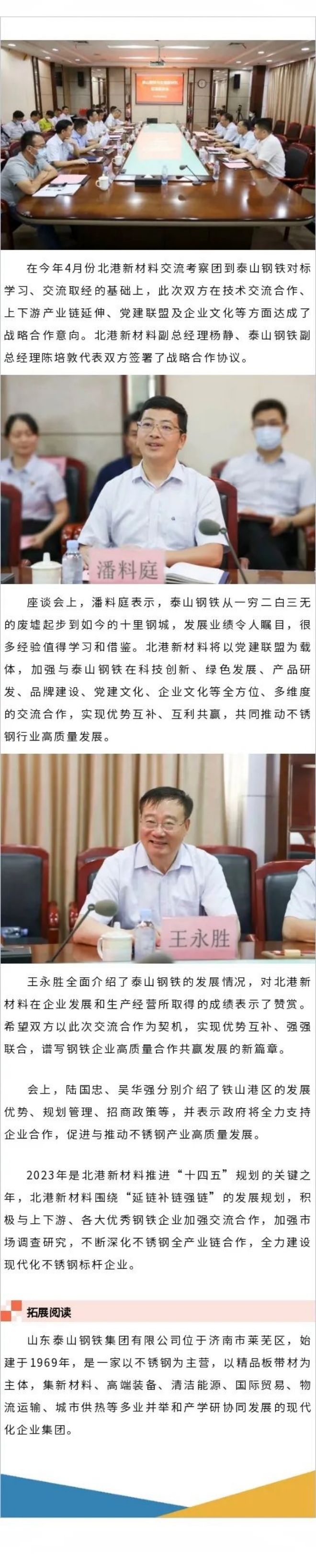 北港新材料公司黨委書記、董事長潘料庭,山東泰山鋼鐵集團有限公司黨委書記、dongshichangwangyongsheng,beihaishitieshangangqufuquchangluguozhong,tieshanganggongyequguanweihuifuzhurenwuhuaqiang,beigangxincailiaogongsizonghuijishiyinguoandengyitongjianzhengleqianyue。