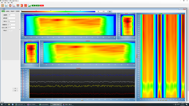 係統界麵(包括過程參數、結晶器各麵溫度雲圖、鑄坯溫度曆程圖,右側的鑄坯溫度曆程圖中異常部分為換水口對鑄坯的影響區域。)