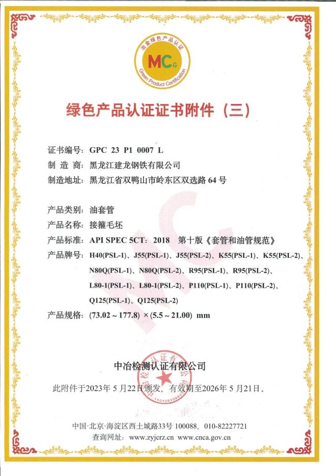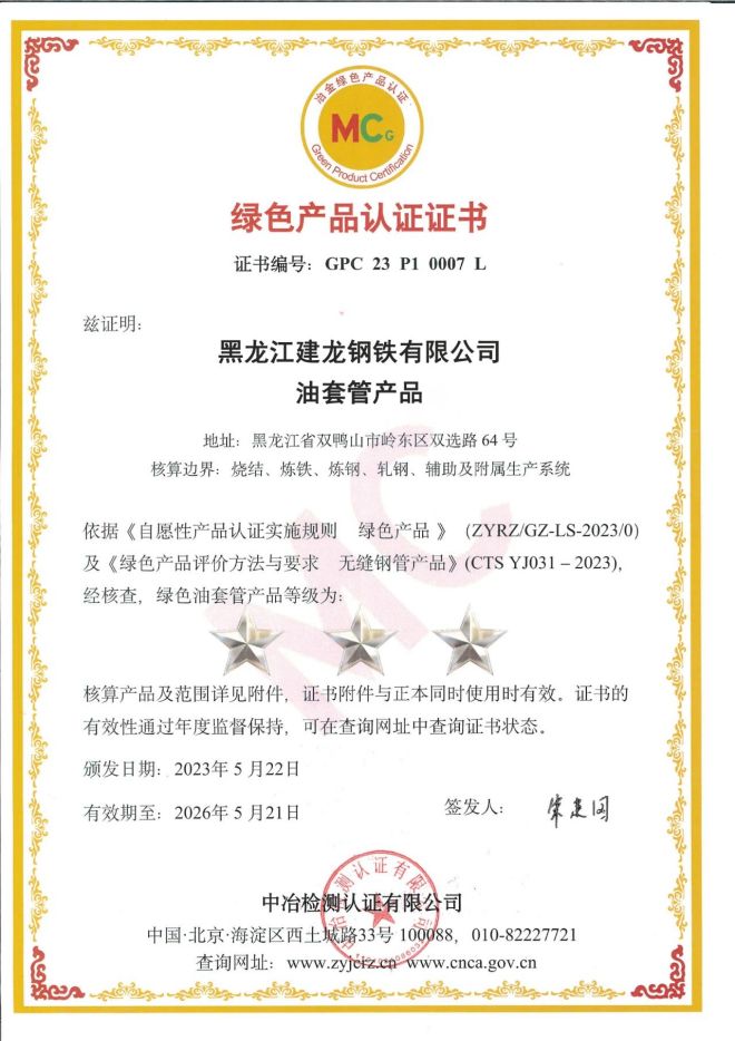 黑龍江建龍油套管產品榮獲“綠色產品”認證
