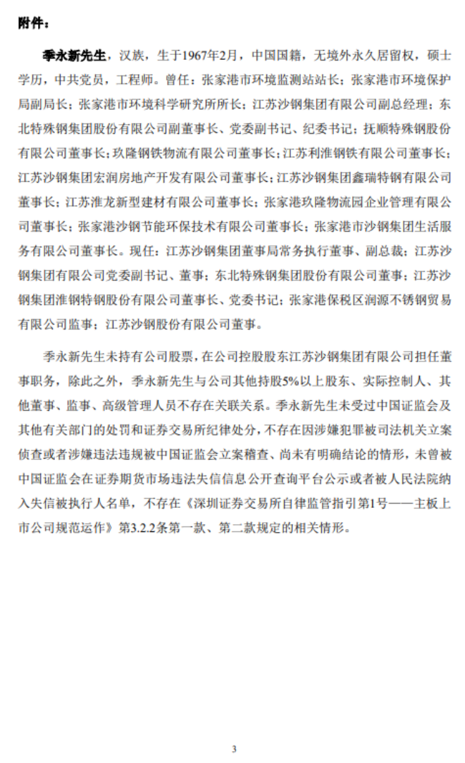 季永新先生,漢族,生於1967年2月,中國國籍,無境外永久居留權,碩士學曆,中共黨員,工程師。曾任:張家港市環境監測站站長;張家港市環境保護局副局長;張家港市環境科學研究所所長;江蘇沙鋼集團有限公司副總經理;東北特殊鋼集團股份有限公司副董事長、黨委副書記、紀委書記;撫順特殊鋼股份有限公司董事長;玖隆鋼鐵物流有限公司董事長;江蘇利淮鋼鐵有限公司董事長;江蘇沙鋼集團宏潤房地產開發有限公司董事長;江蘇沙鋼集團鑫瑞特鋼有限公司董事長;江蘇淮龍新型建材有限公司董事長;張家港玖隆物流園企業管理有限公司董事長;張家港沙鋼節能環保技術有限公司董事長;張家港市沙鋼集團生活服務有限公司董事長。現任:江蘇沙鋼集團董事局常務執行董事、副總裁;江蘇沙鋼集團有限公司黨委副書記、董事;東北特殊鋼集團股份有限公司董事;江蘇沙鋼集團淮鋼特鋼股份有限公司董事長、黨委書記;張家港保稅區潤源不鏽鋼貿易有限公司監事;江蘇沙鋼股份有限公司董事。