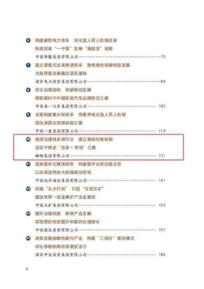 收錄《引領示範:國企改革三年行動綜合典型案例集》中的鞍鋼集團案例,從“堅持‘兩個一以貫之’ 製度優勢轉化為治理效能”“堅持戰略引領 構建產業發展新格局”“堅持市場化方向 企業活力動力迸發”三個方麵係統闡述了鞍鋼集團堅持用足用好改革這個關鍵一招,堅定不移走“改革+市場”之路,以“標準化清單+差異化管控”持續增強治理效能,以鋼鐵和礦業“雙核”戰略服務構建新發展格局,以“契約化”“合同化”“價值化”激勵約束長效機製充分激發活力動力,奮力打造高質量發展新鞍鋼,向著世界一流企業闊步前行的改革發展曆程。