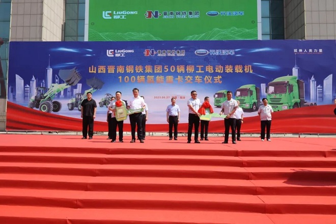 2023年6月27日,晉南鋼鐵50輛電動裝載機、100輛氫能重卡交車儀式在集團文化廣場隆重舉行,這是該集團繼去年8月一次性投運300輛氫能重卡後,再次向清潔低碳綠色物流領域發力。