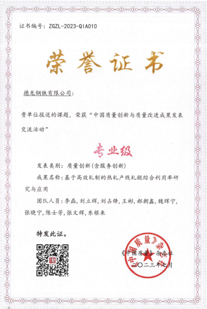 以“質”取勝,德龍鋼鐵再獲質量創新重磅獎項