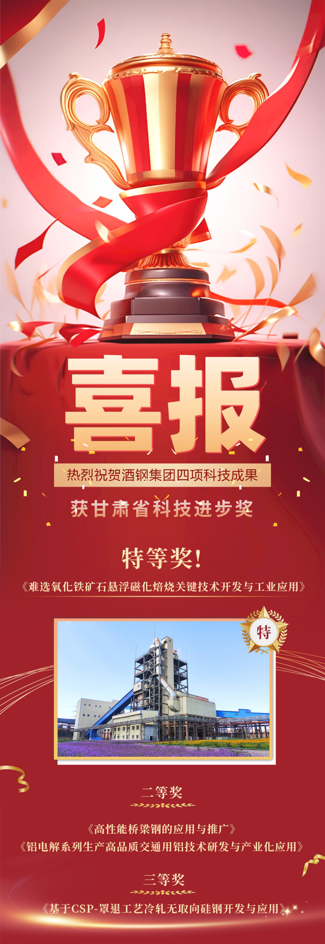 酒鋼榮獲甘肅省科技進步獎特等獎 2項科技成果獲二等獎 1項科技成果獲三等獎