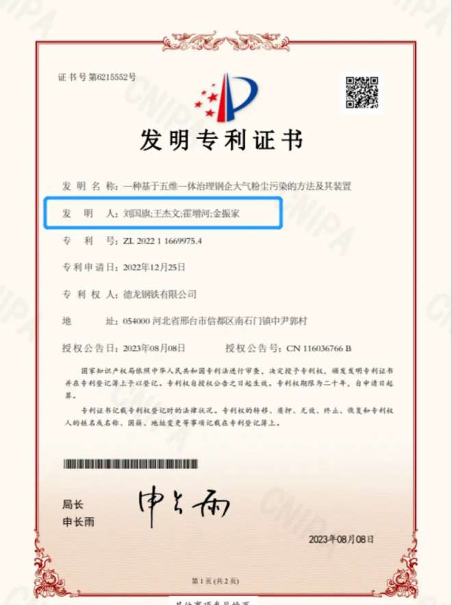 8月8日,由德龍鋼鐵集團執行總裁劉國旗為第一發明人的《一種基於五維一體治理鋼企大氣粉塵汙染的方法及裝置 》發明專利獲授權,此項專利是工業企業內唯一的環保智能管控技術發明專利,突破了環保集中管控的技術瓶頸,實現了“信息化、智能化”有效融合。截至目前,邢台德龍累計受理專利433項,已授權專利337項,其中發明專利36個。