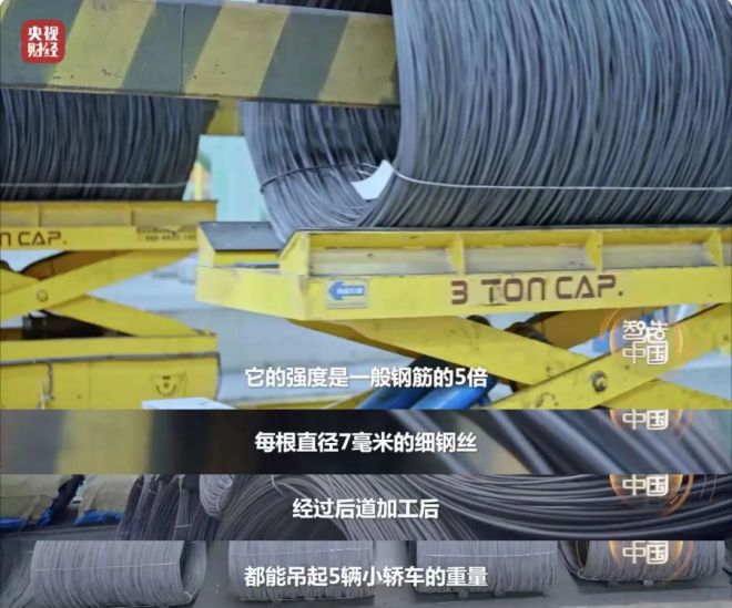 智能化高標準生產的全球強度最高的纜索鋼絲用鋼盤條的強度能達到一般鋼筋的5倍。每根直徑7毫米的細鋼絲經過後道加工後,都能吊起5輛小轎車的重量。