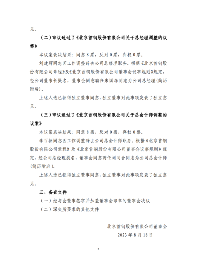首鋼股份2023年度董事會第四次臨時會議8月18日以通訊表決方式召開,會議審議通過了《北京首鋼股份有限公司關於董事調整的議案》《北京首鋼股份有限公司關於總經理調整的議案》,董事會同意聘任朱國森同誌為公司總經理,聘任劉同合同誌為公司總會計師。