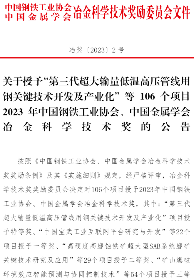 近日,冶金科學技術獎獎勵委員會公布了2023年中國鋼鐵工業協會、中國金屬學會冶金科學技術獎獲獎公告,公布獲獎項目106項。該獎項是中國冶金行業最高科學技術獎。中鋼集團獲得一等獎1項、二等獎1項、三等獎4項的好成績。