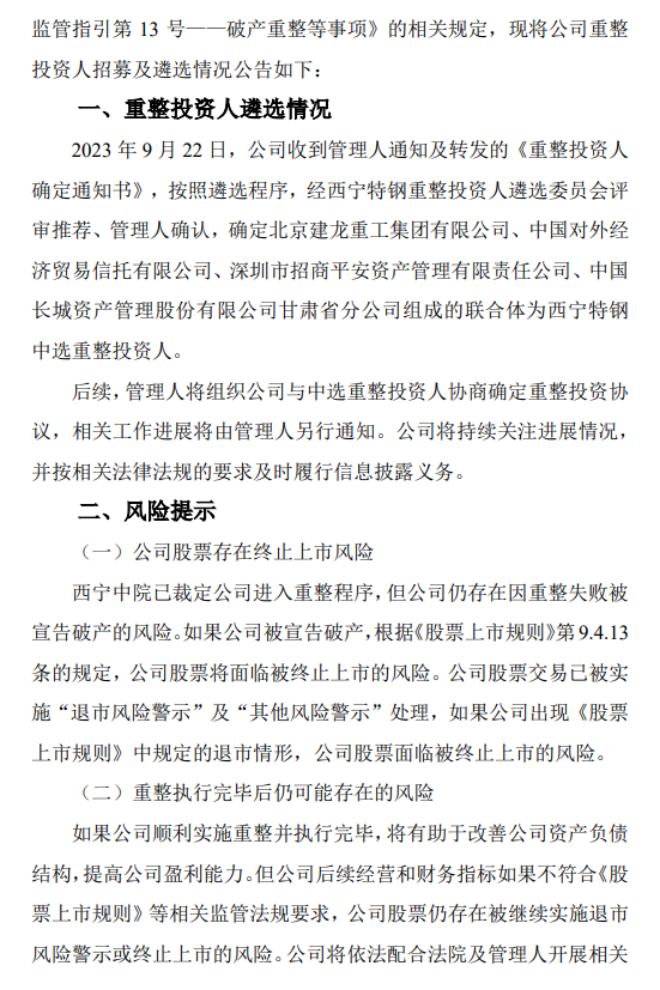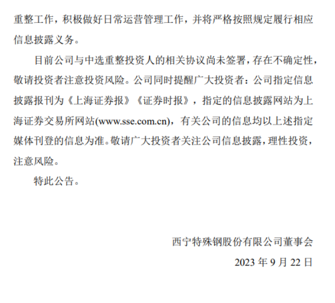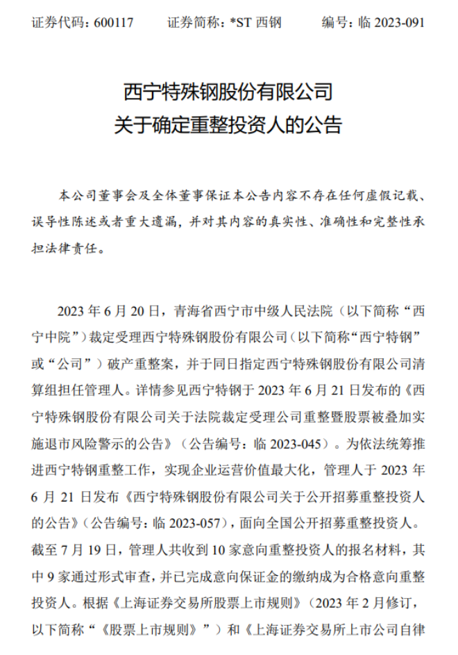 9月23日,西寧特鋼發布了《西寧特殊鋼股份有限公司關於確定重整投資人的公告》(以下簡稱《公告》)。