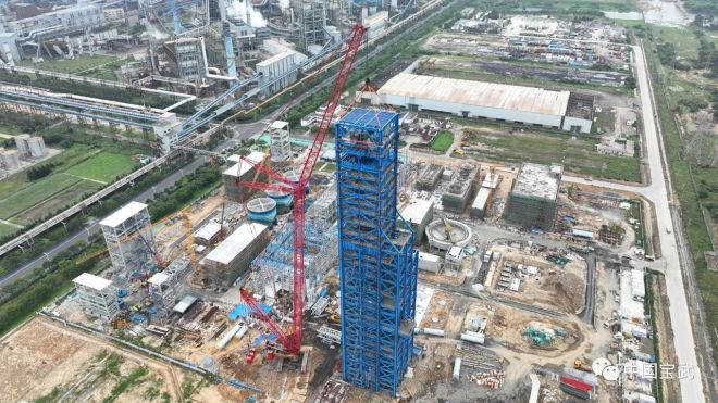 豎爐塔是氫基豎爐這座“減碳神器”DRI冶煉的核心結構區域,其鋼結構最高達126米,最大單重為168噸。項目團隊為應對吊裝高度高、重量大及高空安裝危險性較大等困難,從方案策劃階段就吊裝結構的應力、變形量、擺放以及吊裝車輛的站位、吊裝過程的質量安全把控,每一步作業都反複進行了模擬測算。同時精細統籌現場施工,保證各道工序環環相扣、緊密結合,並安排人員24小時現場全程監護,嚴格把控現場安全與質量。