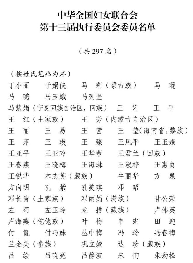大會首先通過了總監票人、監票人名單(草案),隨後以無記名投票方式選舉產生了中華全國婦女聯合會第十三屆執行委員會委員。297人當選中華全國婦女聯合會第十三屆執行委員會委員。
