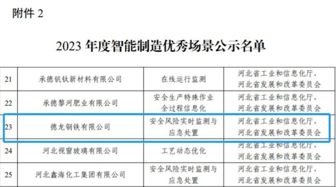 近日,國家工業和信息化部公示了2023年度智能製造示範工廠揭榜單位和優秀場景名單,通過企業申報、市工信局審核推薦、省工信廳、國家工信部評審等環節的層層遴選,邢台德龍申報的“安全風險實時監測與應急處置”案例成功入選國家智能製造優秀場景。