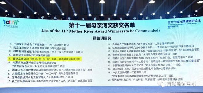 11月1日,在首鋼園舉行的2023年世界青年發展論壇應對氣候與糧食危機主題論壇上,首鋼京唐公司“燃-熱-電-水-鹽”五(wu)效(xiao)一(yi)體(ti)高(gao)效(xiao)循(xun)環(huan)利(li)用(yong)項(xiang)目(mu)獲(huo)得(de)第(di)十(shi)一(yi)屆(jie)母(mu)親(qin)河(he)獎(jiang)綠(lv)色(se)項(xiang)目(mu)獎(jiang)。母(mu)親(qin)河(he)獎(jiang)是(shi)在(zai)生(sheng)態(tai)文(wen)明(ming)建(jian)設(she)領(ling)域(yu)設(she)立(li)的(de)唯(wei)一(yi)全(quan)國(guo)性(xing)獎(jiang)項(xiang)。首(shou)鋼(gang)京(jing)唐(tang)陳(chen)恩(en)軍(jun)作(zuo)為(wei)項(xiang)目(mu)代(dai)表(biao)上(shang)台(tai)領(ling)獎(jiang)。