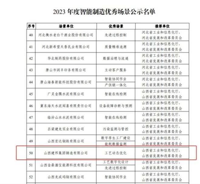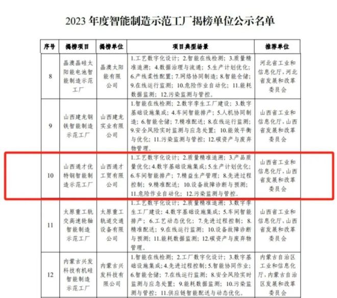近日,國家工業和信息化部發布《關於2023年度智能製造示範工廠揭榜單位和優秀場景名單的公示》,山西通才工貿有限公司及山西建邦鑄造有限公司均榜上有名。