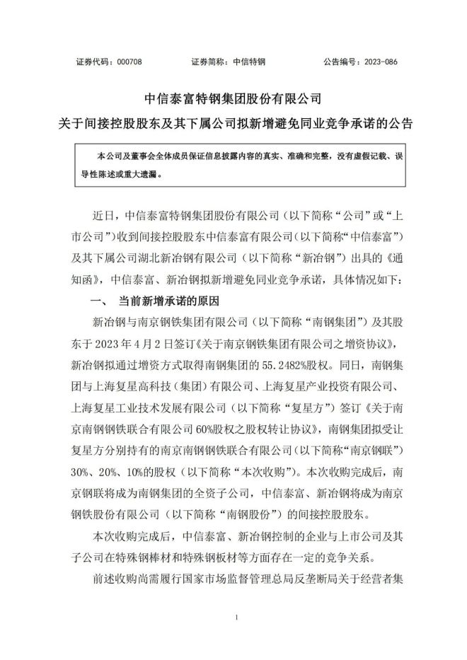 新冶鋼與南京鋼鐵集團有限公司(以下簡稱“南鋼集團”)及其股東於 2023 年 4 月2 日簽訂《關於南京鋼鐵集團有限公司之增資協議》,新冶鋼擬通過增資方式取得南鋼集團的 55.2482%股權。同日,南鋼集團與上海複星高科技(集團)有限公司、上海複星產業投資有限公司、上海複星工業技術發展有限公司(以下簡稱“複星方”)簽訂《關於南京南鋼鋼鐵聯合有限公司60%股權之股權轉讓協議》,南鋼集團擬受讓複星方分別持有的南京南鋼鋼鐵聯合有限公司(以下簡稱“南京鋼聯”)30%、20%、10%的股權(以下簡稱“本次收購”)。本次收購完成後,南京鋼聯將成為南鋼集團的全資子公司,中信泰富、新冶鋼將成為南京鋼鐵股份有限公司(以下簡稱“南鋼股份”)的間接控股股東。