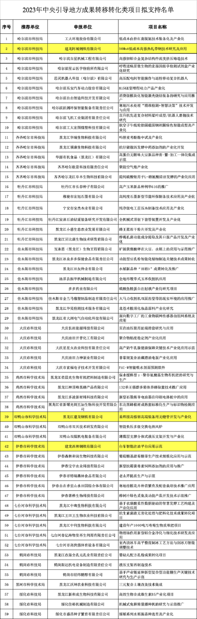 建龍集團黑龍江區域3項目入選“中央引導地方科技發展資金成果轉移轉化類支持項目”