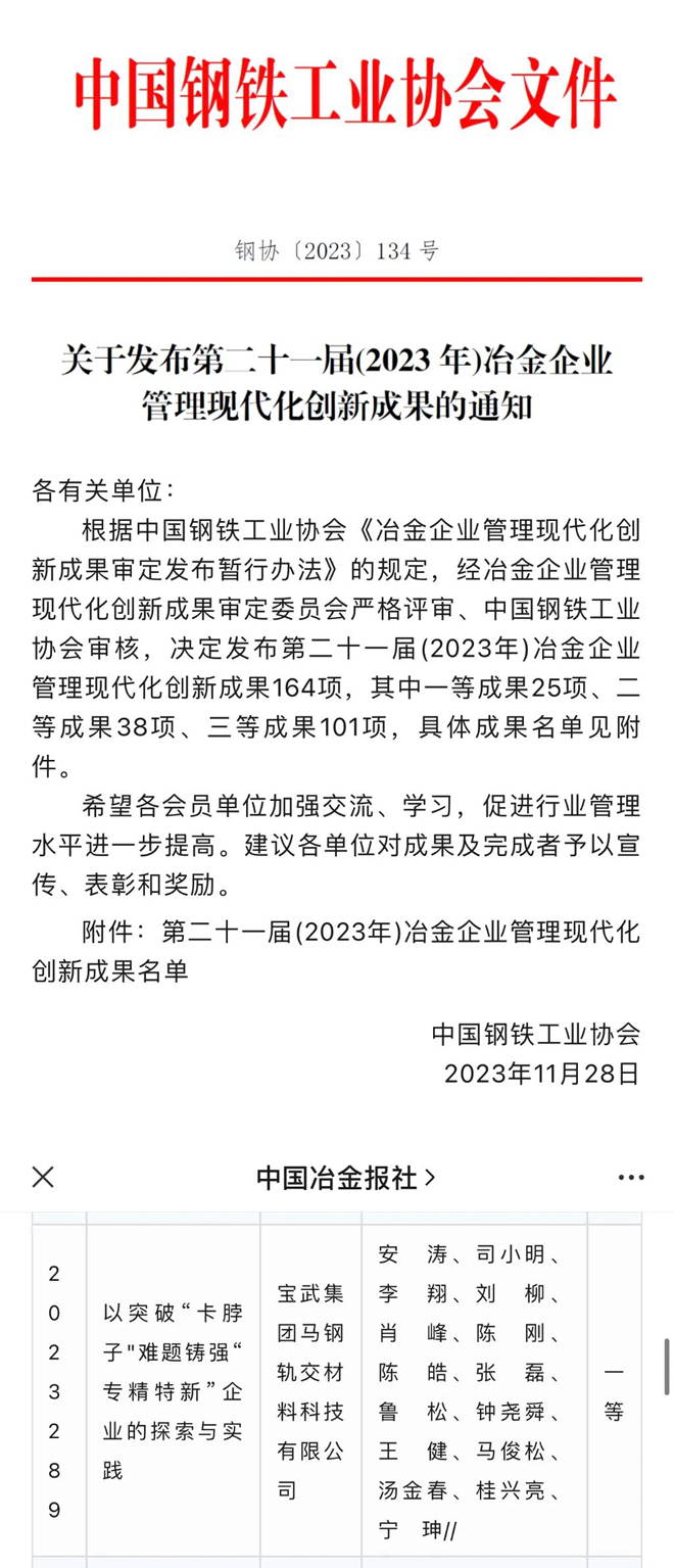 冶金企業管理現代化創新成果獎由中國鋼鐵工業協會設立、審定,旨在鼓勵企業管理的改革與創新、促進鋼鐵工業的健康可持續發展,是冶金管理最高獎項。今年共發布成果164項,其中一等成果25項、二等成果38項、三等成果101項。