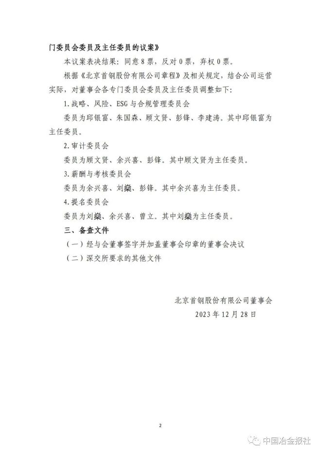 2023年12月28日晚,首鋼股份(000959.SZ)發布公告稱,因工作調整原因,趙民革申請辭去公司董事長、董事及“戰略、風險、ESG與合規管理委員會”主任委員職務,辭職後不再擔任公司任何職務。根據首鋼股份董事會決議,邱銀富接替趙民革成為首鋼股份新一任董事長。