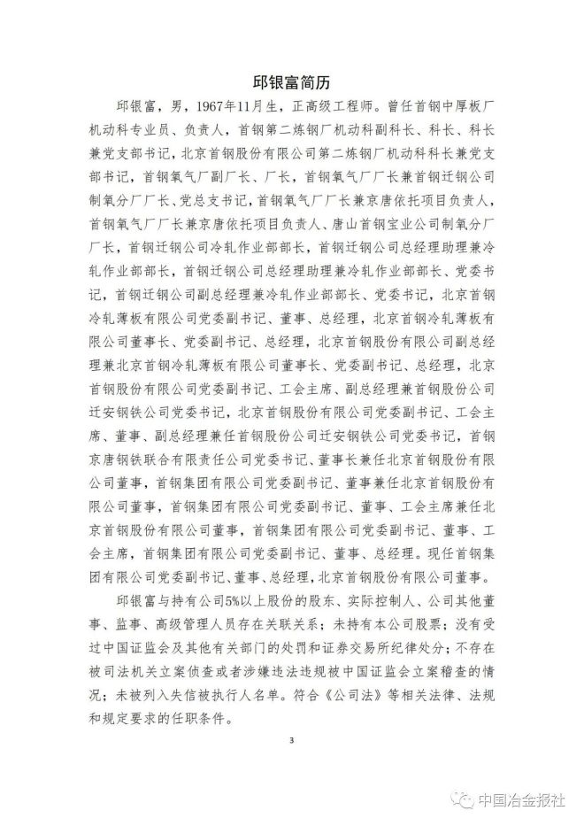 公開簡曆顯示,邱銀富,1967年11月生,正高級工程師,現任首鋼集團有限公司黨委副書記、董事、總經理,首鋼股份董事。
