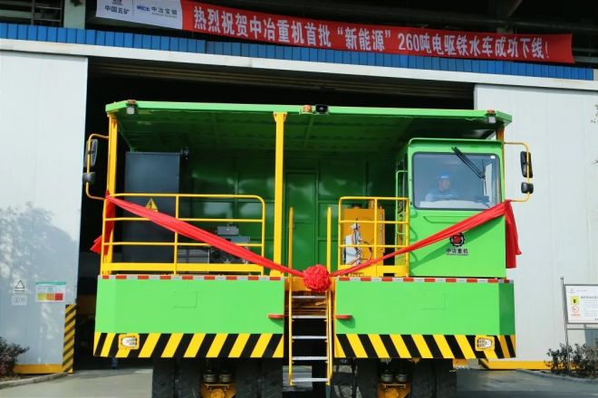 “中冶重機”品牌“新能源”260噸電驅鐵水車額定載重260噸,最大載重280噸,動力電池容量282千瓦時,行走總功率達到480千瓦,滿載爬坡能力4%以上,每車每年可減少碳排放約34噸,適用於國內外各大冶金企業煉鐵高爐至煉鋼轉爐間轉駁運輸1600攝氏度液態高溫鐵水。該產品集成了高效能電驅橋技術、ETCS多電機驅動控製技術、多係統能量管理及分配技術、電動和蓄能組合轉向技術和電池安全管理技術等多項關鍵核心技術。