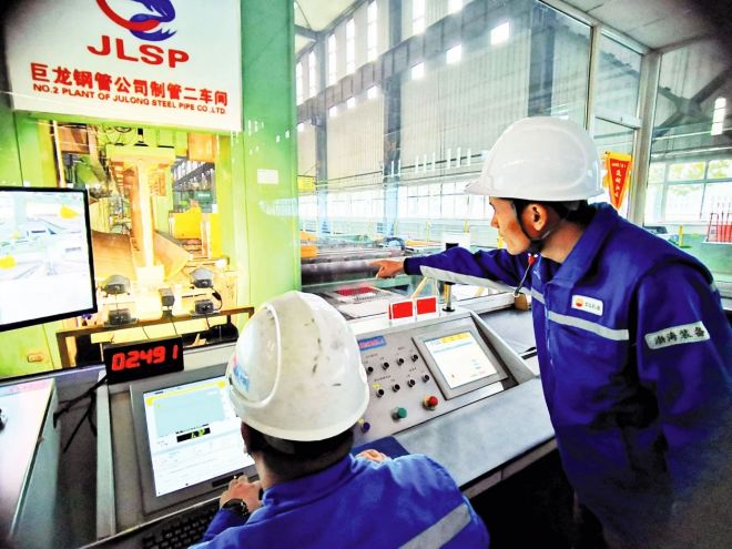 中石油渤海裝備巨龍鋼管公司工作人員正在利用成型機對鞍鋼管線鋼進行製管作業。