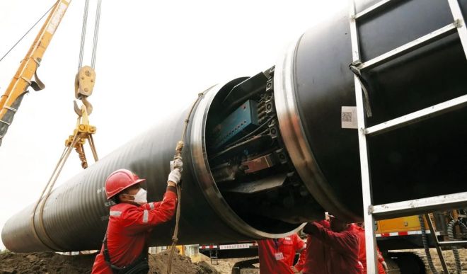 國家管網集團施工人員正在安裝由鞍鋼管線鋼製作的管道。