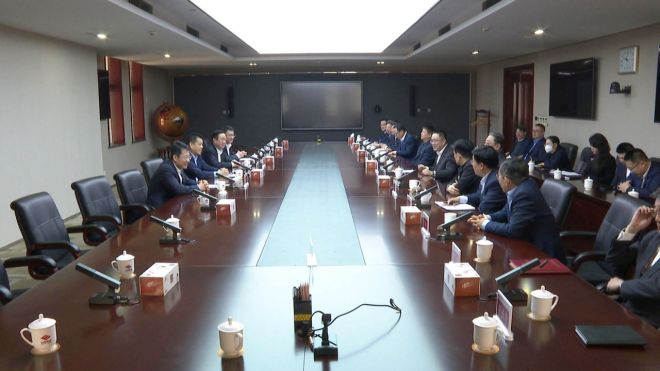 2月6日,山鋼集團黨委書記、董事長張寶才在總部辦公樓會見了到訪的山東能源集團黨委書記、董事長李偉一行。