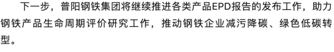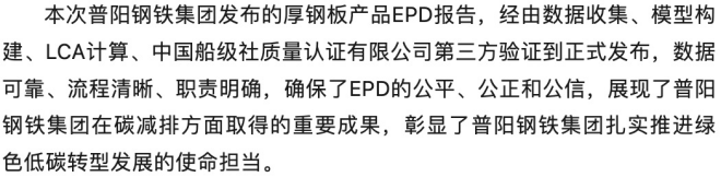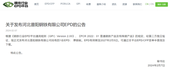 2024年2月7日,普陽鋼鐵集團厚鋼板產品EPD報告在中國鋼鐵工業協會鋼鐵EPD平台正式發布,成為河北省內首家厚鋼板產品EPD發布企業。