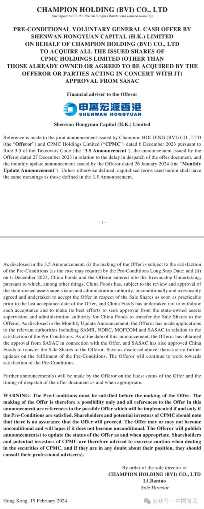 2023年12月6日(ri),中(zhong)國(guo)寶(bao)武(wu)聯(lian)合(he)國(guo)新(xin)投(tou)資(zi)已(yi)經(jing)向(xiang)市(shi)場(chang)公(gong)告(gao)擬(ni)對(dui)中(zhong)糧(liang)包(bao)裝(zhuang)發(fa)起(qi)自(zi)願(yuan)全(quan)麵(mian)現(xian)金(jin)要(yao)約(yue)收(shou)購(gou),本(ben)次(ci)要(yao)約(yue)收(shou)購(gou)需(xu)要(yao)履(lv)行(xing)的(de)監(jian)管(guan)審(shen)批(pi)主(zhu)要(yao)涉(she)及(ji)國(guo)務(wu)院(yuan)國(guo)資(zi)委(wei)、商務部、國家發展和改革委員會、國家外彙管理局、國家市場監督管理總局以及相關境外反壟斷主管部門。