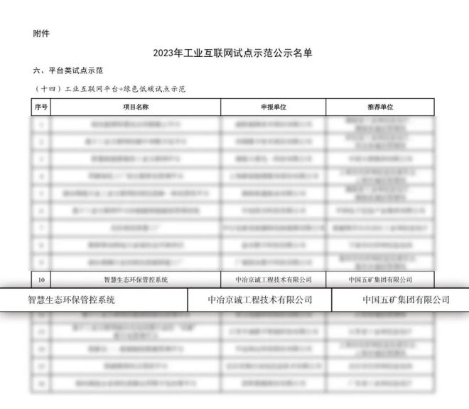 3月21日,工業和信息化部正式公布了2023年工業互聯網試點示範項目名單,中冶京誠“智慧生態環保管控係統”成功入選工信部2023年工業互聯網試點示範項目,該項目為中國五礦本次推薦申報的唯一入選項目。