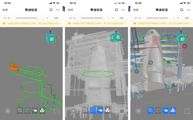 “賽迪輕呈”平台的多項功能已在福建三鋼本部高爐、陝西漢鋼中厚板、四川達鋼煉鋼等幾十個項目中普及應用,有效解決了二維圖紙讀圖困難、應用舊版圖紙引起施工質量問題、項目各方遠程了解現場情況難等問題,獲得普遍好評。