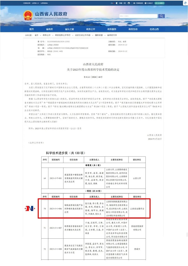 近日,山西省人民政府發布《關於2023年度山西省科學技術獎勵的決定》,晉南鋼鐵集團“鋼鐵流程鋼化聯產協同降碳的集成創新與應用項目”榮獲2023年度山西省科學技術進步獎一等獎。