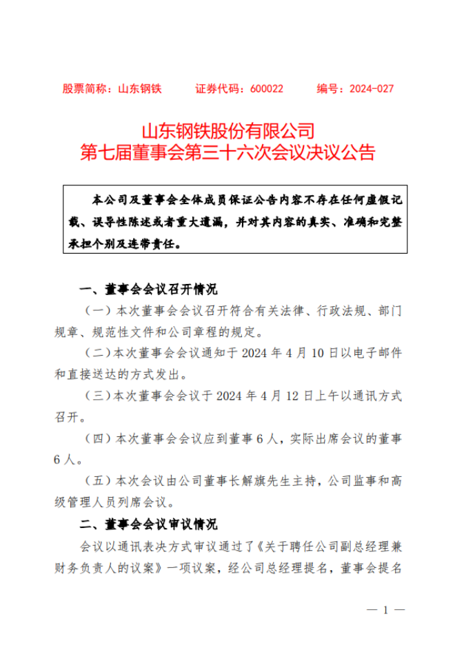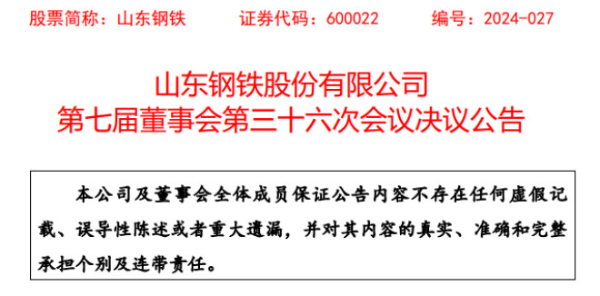 4月13日,山鋼股份發布了《山東鋼鐵股份有限公司第七屆董事會第三十六次會議決議公告》(以下簡稱《公告》)。