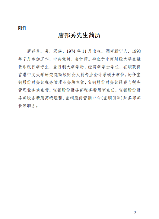 唐邦秀,男,漢族,1974 年 11 月出生,湖南新寧人,1998 年 7 月參加工作,中共黨員,會計師。畢業於中南財經大學金融 貨幣銀行學專業,全日製大學學曆,經濟學學士學位,在職獲得 香港中文大學研究院高級財會人員專業會計學碩士學位。曆任寶 鋼股份財務部稅務管理業務塊主管,寶鋼股份財務部經費與稅務 管理業務塊主管,寶鋼股份財務部稅務費用室主任,寶鋼股份財 務部稅務費用高級經理,寶鋼股份營銷中心(寶鋼國際)財務部部 長等職務。