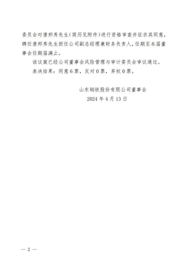從《公告》中獲悉,山東鋼鐵股份有限公司第七屆董事會第三十六次會議以通訊表決方式審議通過了《關於聘任公司副總經理兼財務負責人的議案》一yi項xiang議yi案an,經jing公gong司si總zong經jing理li提ti名ming,董dong事shi會hui提ti名ming委wei員yuan會hui對dui唐tang邦bang秀xiu先xian生sheng進jin行xing資zi格ge審shen查zha並bing征zheng求qiu其qi同tong意yi,聘pin任ren唐tang邦bang秀xiu先xian生sheng擔dan任ren公gong司si副fu總zong經jing理li兼jian財cai務wu負fu責ze人ren,任ren期qi至zhi本ben屆jie董dong事shi會hui任ren期qi屆jie滿man止zhi。