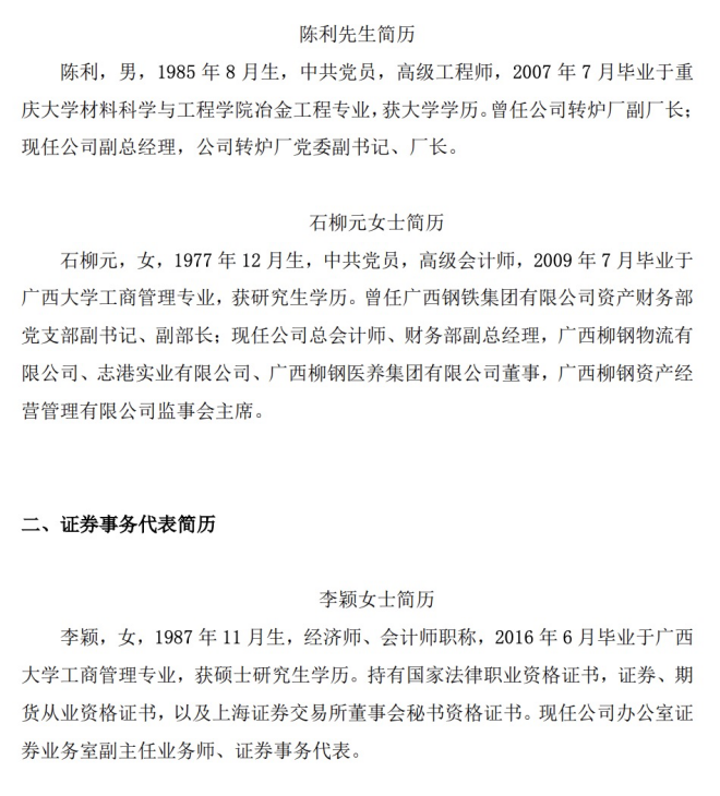石柳元,女,1977年12月生,中共黨員,高級會計師,2009年7月畢業於廣西大學工商管理專業,獲研究生學曆。曾任廣西鋼鐵集團有限公司資產財務部黨支部副書記、副部長;現任公司總會計師、財務部副總經理,廣西柳鋼物流有限公司、誌港實業有限公司、廣西柳鋼醫養集團有限公司董事,廣西柳鋼資產經營管理有限公司監事會主席。