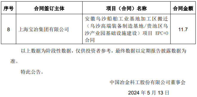 5月14日,中國中冶發布了《中國中冶2024年1月-4月經營情況簡報》。根據公告顯示:2024年1月-4月,中國中冶集團新簽合同額4,108.9億,同比降低2.5%。新簽海外合同額人民幣209.0億元,較上年同期增長151.2%。